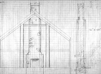 At the first floor the 4' x 8' base steps down 8" on all sides for the fireplace. This will leave room for future stone facing. Fireplace opening will be 4' by 4' with a 2.5' hearth running the full 8' width of the structure. On the back side of the fireplace (kitchen) will be an 8" round flue for a wood stove.